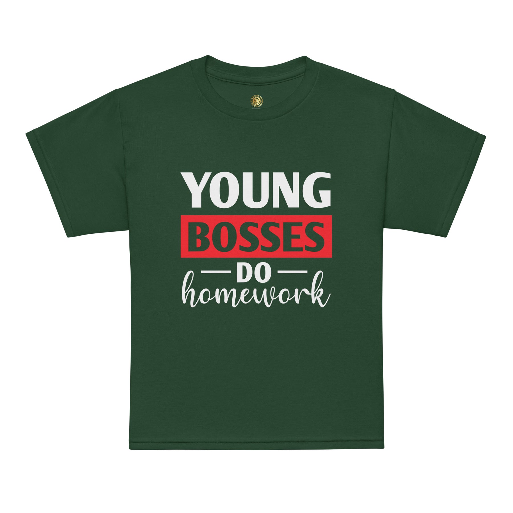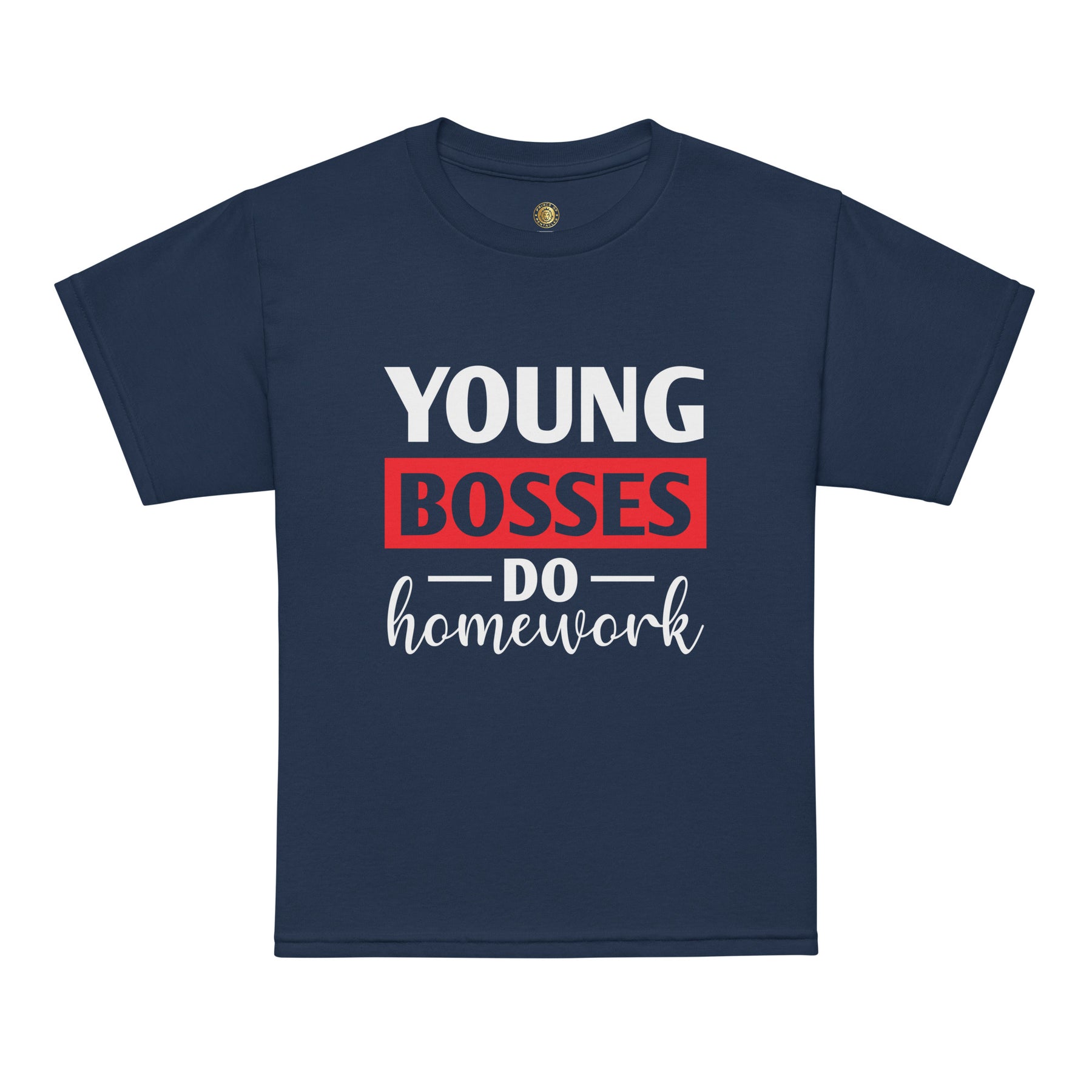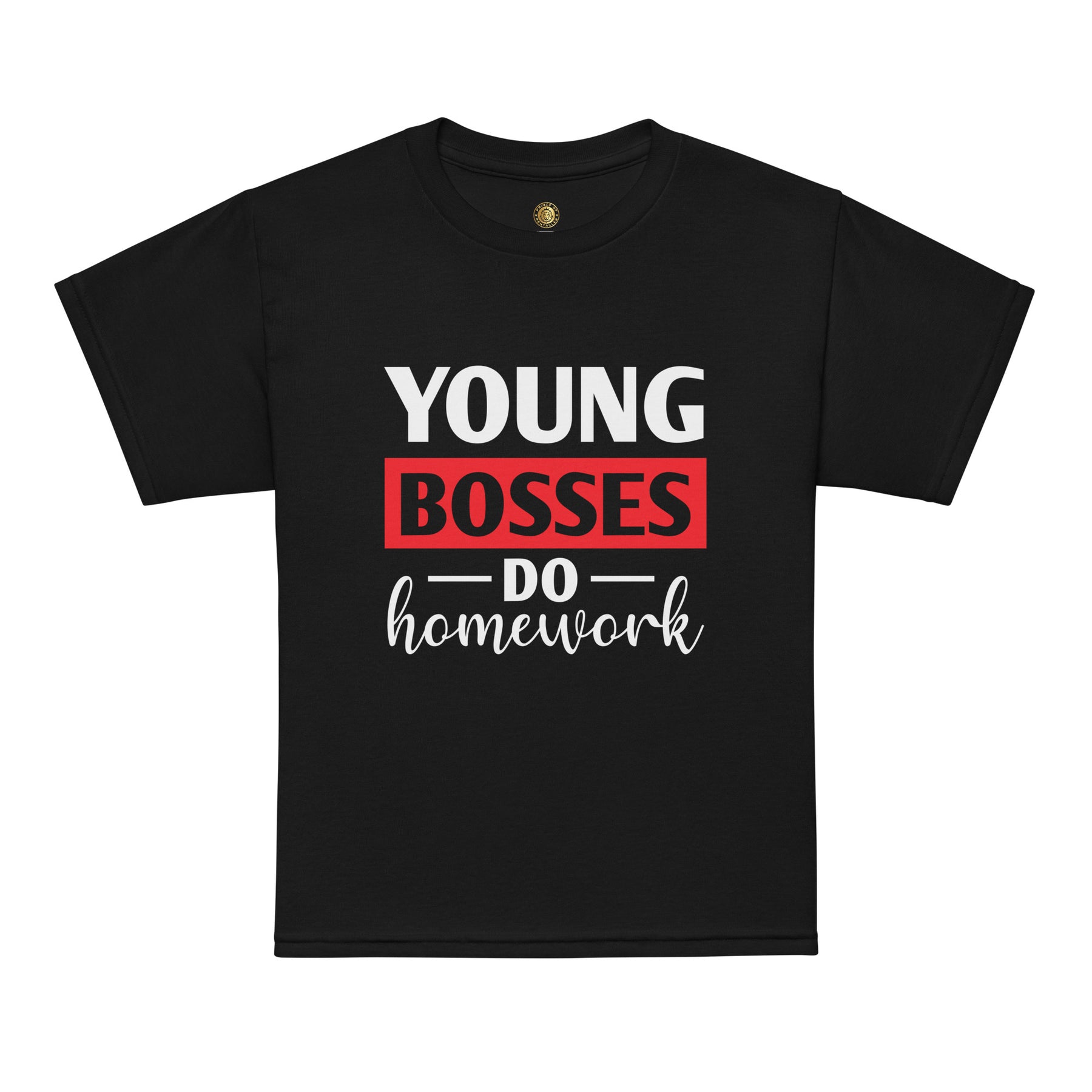 Boy wearing a Prince of pentacles boss   young vibes bosses do homework  graphic tee from Prince of Pentacles motivational boy clothing brand