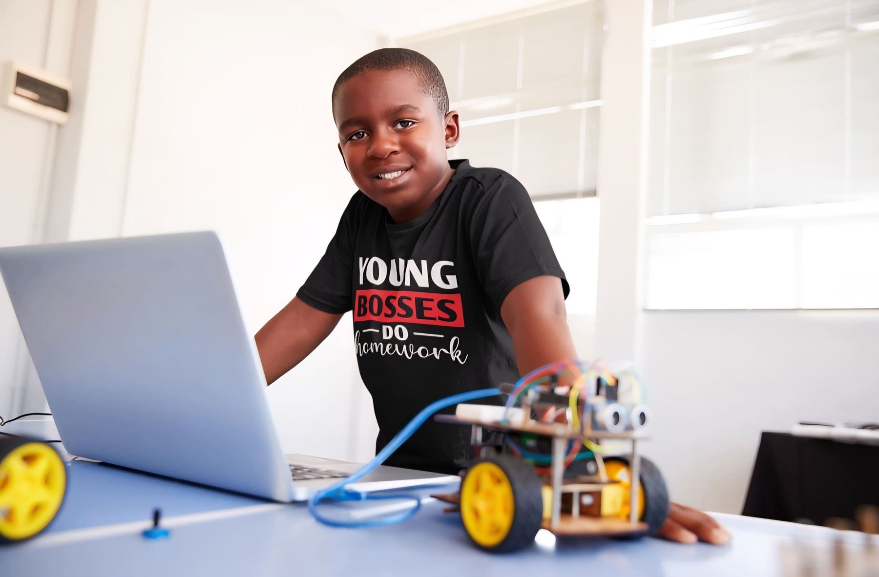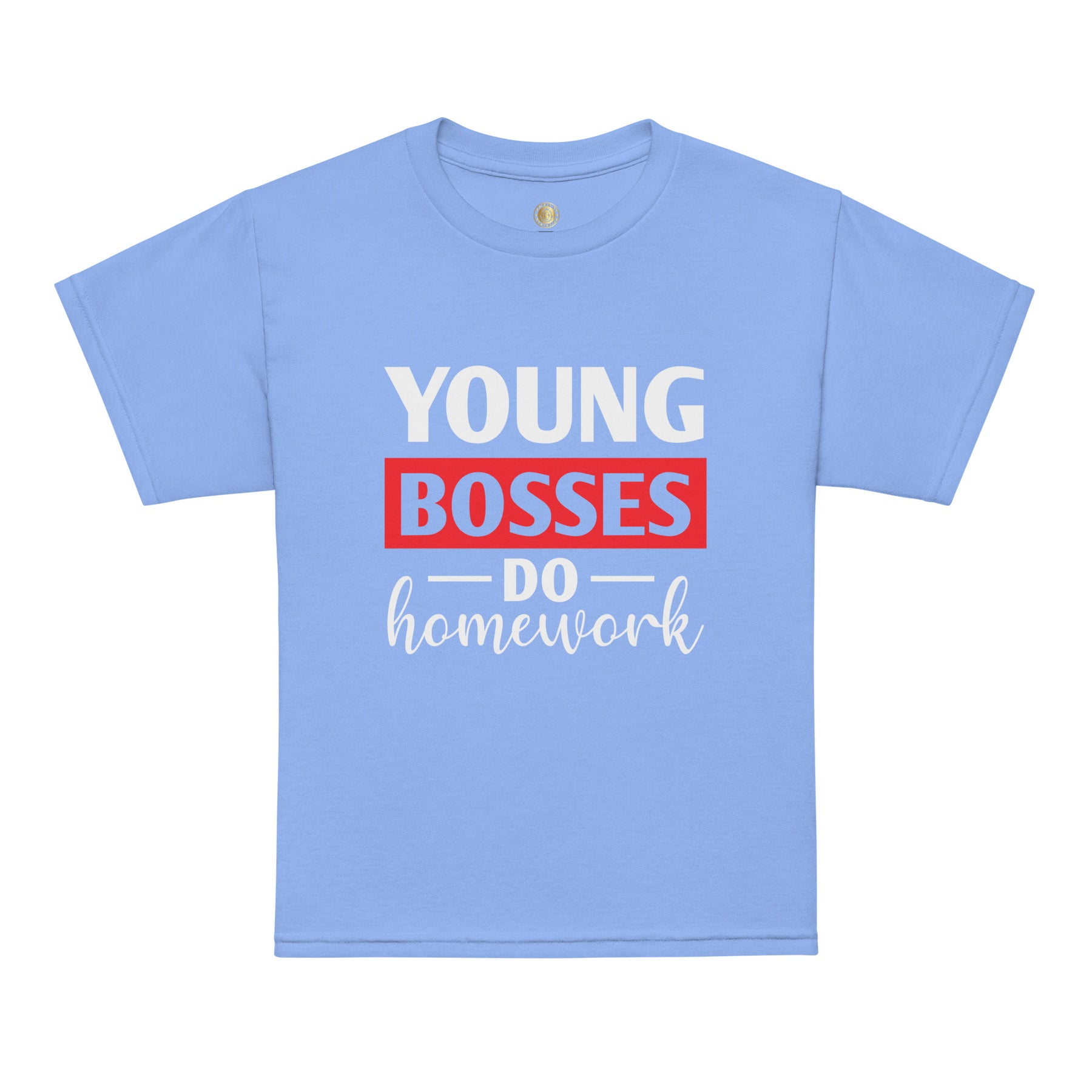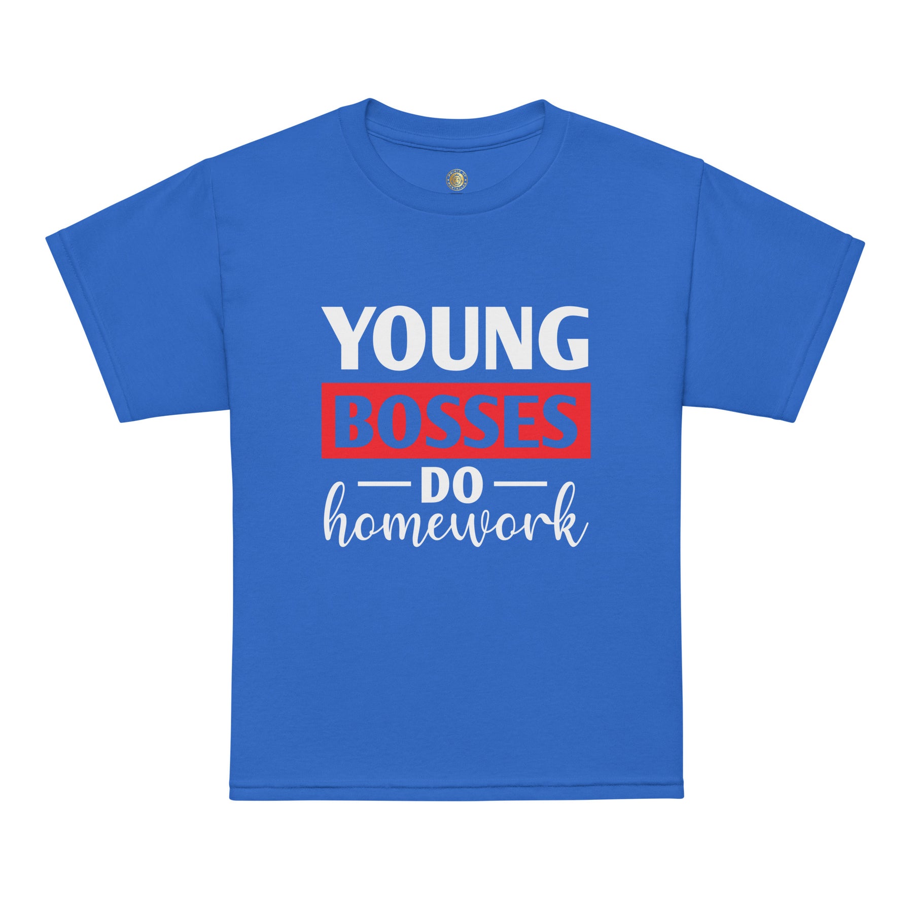Boy wearing a Prince of pentacles boss   young vibes bosses do homework  graphic tee from Prince of Pentacles motivational boy clothing brand