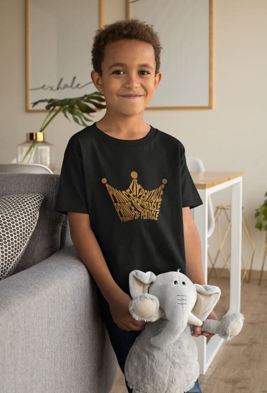 Boy wearing prince vibes crown  graphic tee from Prince of Pentacles motivational boy clothing brand